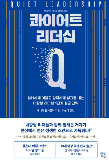 제니퍼 칸와일러의 <콰이어트 리더십> 은 자기 발견과 개인적 발전의 여정에서 누구나 반드시 읽어야 할 책입니다. 내성적인 리더십에 대한 탐구를 통해, 이 책은 효과적인 리더가 되기 위해 무엇이 필요한지에 대한 선입견에 도전합니다. 페이지를 훑어보면서, 우리는 침묵 속의 힘, 조용한 영향력의 기술, 그리고 우리 팀 내에서 조용한 혁명을 일으킬 수 있는 잠재력을 발견합니다. 칸와일러의 글은 단순히 내성적인 리더십을 기념하는 것이 아니라 독자들이 그들의 진정한 자아를 수용할 수 있도록 힘을 실어주는 지침서입니다. 내성적인 사람들이 자신의 독특한 장점을 인식하고 활용하고, 외향적인 사람들이 표면 아래에 종종 존재하는 조용한 힘을 인식하도록 행동을 촉구하는 것입니다. <콰이어트 리더십> 은 독자들이 진정성을 가지고 주도하고, 영향력을 가지고 의사소통하며, 각 개인 내에서 장점의 다양성을 축하하는 협력적인 환경을 조성하도록 격려하는 혁신적인 여정입니다.